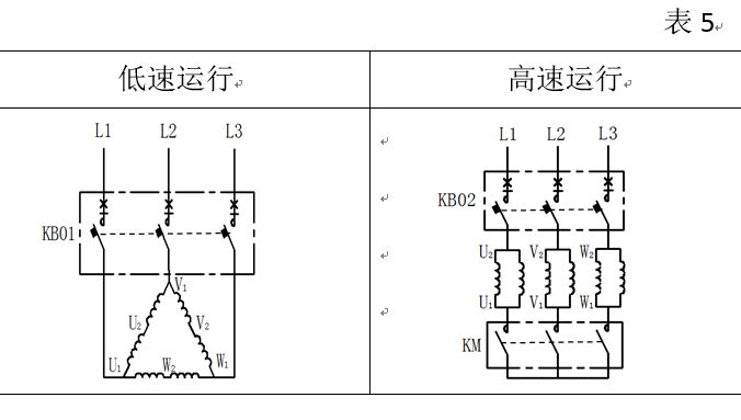 許多場合需要使用雙速電動機如一般工業(yè)建筑、民用建筑、排風(fēng)兼排煙風(fēng)機。通常需要兩種風(fēng)機轉(zhuǎn)速分別用于正常(平時低速排風(fēng))和緊急情況(如發(fā)生火災(zāi)需要高速排煙),為此需要采用雙速控制器去控制兩種轉(zhuǎn)速的電動機?;趦膳_KB0輔以適當?shù)慕佑|器等構(gòu)成KB0D雙速控制器裝置,其控制雙速電動機繞組的接線方式見表5。