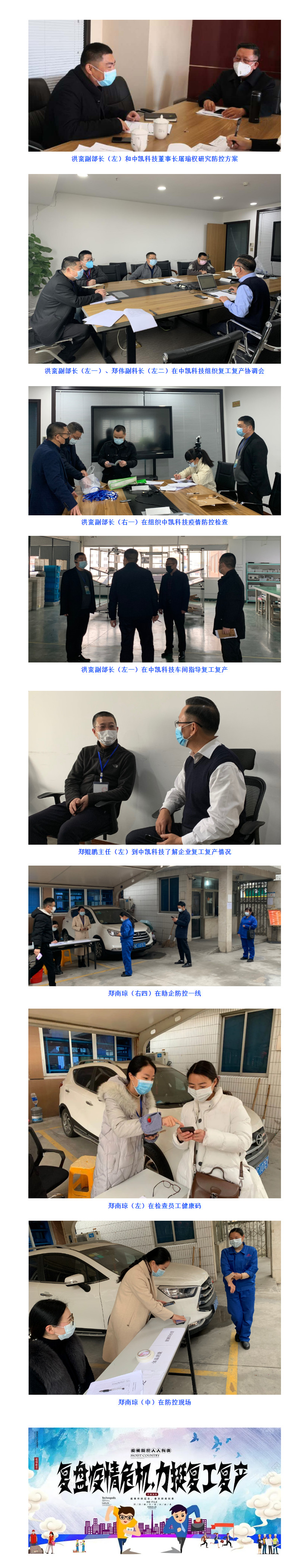 宣傳部洪蠻副部長(zhǎng)立即聯(lián)系柳市鎮(zhèn)相關(guān)領(lǐng)導(dǎo),柳市鎮(zhèn)派政法辦鄭鯤鵬主任聯(lián)系對(duì)接助企復(fù)工復(fù)產(chǎn)。他們和中凱科技董事長(zhǎng)屠瑜權(quán)取得聯(lián)系,溝通復(fù)工復(fù)產(chǎn)前期準(zhǔn)備工作。2月26日,復(fù)工復(fù)產(chǎn)溝通協(xié)調(diào)會(huì)在中凱科技會(huì)議室舉行。洪蠻副部長(zhǎng)親自主持會(huì)議,詳細(xì)了解企業(yè)復(fù)工復(fù)產(chǎn)具體情況,包括返廠員工情況,具體來(lái)自哪些省份,企業(yè)疫情防控方案和措施落實(shí)情況,防控物資準(zhǔn)備情況,洪副部長(zhǎng)對(duì)企業(yè)提出了具體要求,對(duì)落實(shí)措施進(jìn)行了細(xì)致的安排和部署,并指示宣傳部宣傳教育科鄭偉副科長(zhǎng)和鄭南瓊科員兩人具體對(duì)接中凱科技的助企工作,由鄭南瓊在中凱科技蹲點(diǎn)服務(wù)。