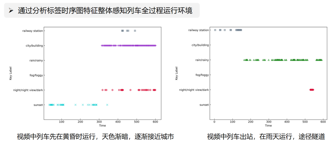 基礎(chǔ)模型RAM擁有“識別一切”能力,無需人工標(biāo)注,可以高精度識別任何常見類別?;赗AM的識別結(jié)果,通過分析標(biāo)簽時序圖特征整體可以感知列車全過程運(yùn)行環(huán)境,感知結(jié)果與列車實際運(yùn)行環(huán)境吻合度較高,示例如下: