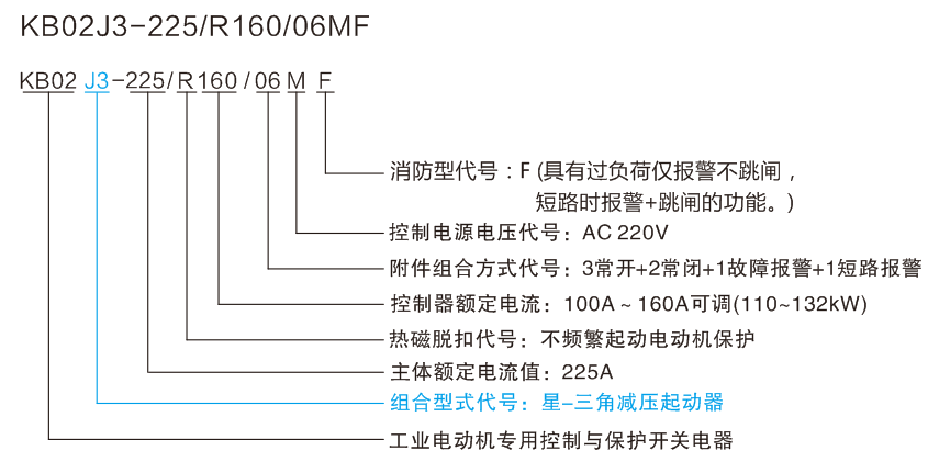 適用于電動(dòng)機(jī)星-三角減壓起動(dòng)的控制與保護(hù),以KB02產(chǎn)品作為主開關(guān),與塑殼斷路器、可逆接觸器、時(shí)間繼電器、電氣聯(lián)鎖及控制回路組合構(gòu)成星-三角減壓起動(dòng)的控制與保護(hù)裝置。