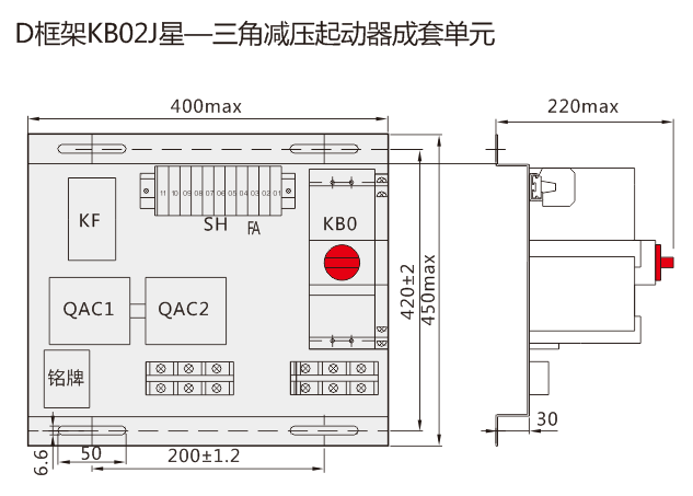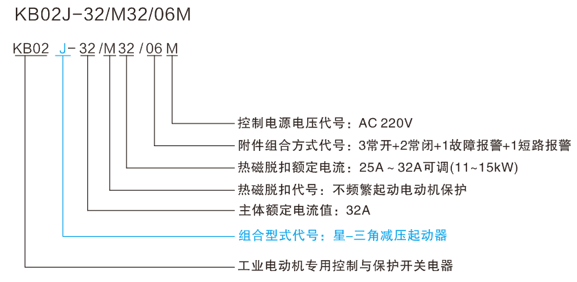 適用于電動機星-三角減壓起動的控制與保護,以KB02產(chǎn)品作為主開關(guān),與接觸器、時間繼電器、電氣聯(lián)鎖及控制回路組合構(gòu)成星-三角減壓起動的控制與保護裝置。