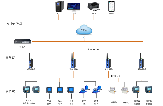 中凱能耗監(jiān)控系統(tǒng)基于中凱云平臺,現(xiàn)場能耗監(jiān)測設(shè)備進行能耗數(shù)據(jù)采集,通過智能網(wǎng)關(guān)組網(wǎng),將數(shù)據(jù)上傳至中凱云平臺。web端及移動端app通過訪問云服務(wù)器同步數(shù)據(jù),監(jiān)控系統(tǒng)實現(xiàn)數(shù)據(jù)監(jiān)測、分析、評估等功能。