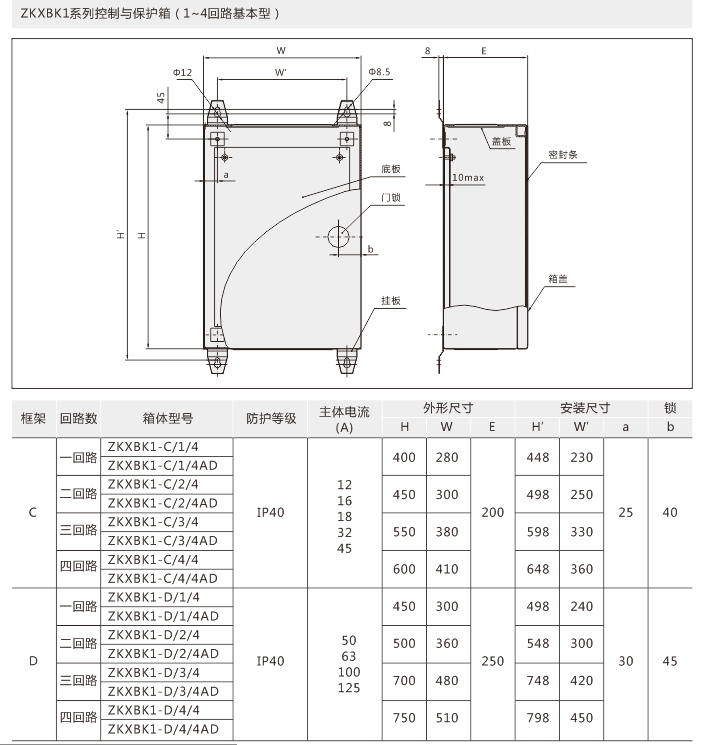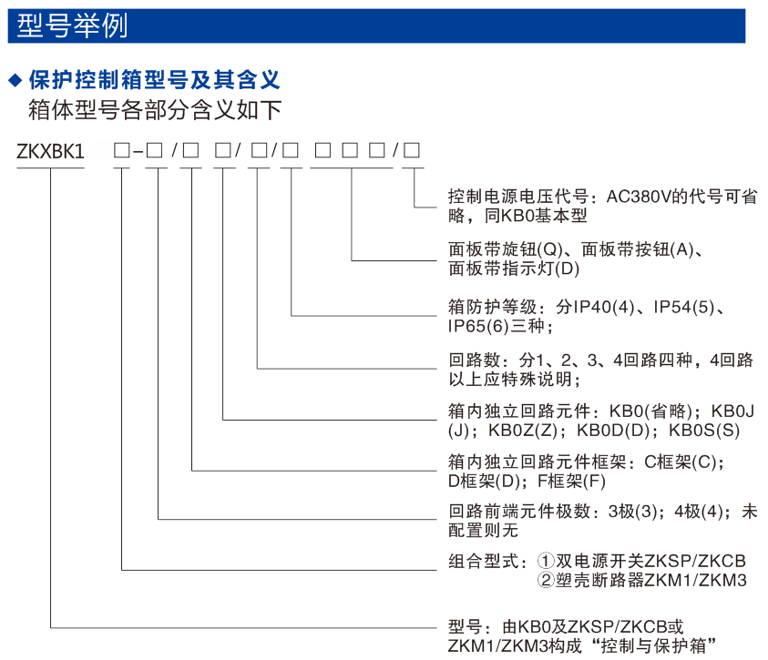 其以KB0作為主開關(guān),配用不同的防護等級箱體,可構(gòu)成防護等級為IP40、IP54、IP65等多種等級的保護控制箱ZKXBK1,適用于戶外以及遠程單獨負載的控制與保護。由KB0、KB0-F、KB0-G、KB0S3、KB0D、KB0N、KB0J、KB0J2、KB0Z等組合構(gòu)成單回路、多回路等多種形式;根據(jù)需要,在箱體面板上可配備選擇開關(guān)、旋鈕、按鈕、信號燈等。與傳統(tǒng)的各種保護箱、綜合式、電磁起動器相比,具有體積小、重量輕、操作安全可靠、接線便捷、防護等級高等特點,且可以選擇就地控制、遠程控制和二者兼有的方式進行操作,是替代傳統(tǒng)產(chǎn)品的極佳選擇。